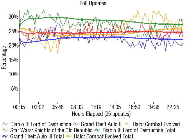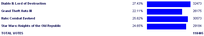 Halo: Combat Evolved - 32.52% Diablo II: Lord of Destruction - 26.47% Grand Theft Auto III - 25.44% Star Wars: Knights of the Old Republic - 15.54% |