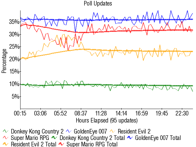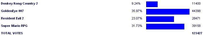 GoldenEye 007 - 32.81% Super Mario RPG - 26.81% Resident Evil 2 - 23.11% Donkey Kong Country 2 - 17.47% |