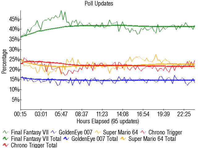 Final Fantasy VII - 35.42% Super Mario 64 - 26.46% Chrono Trigger - 22.33% GoldenEye 007 - 16.06% |