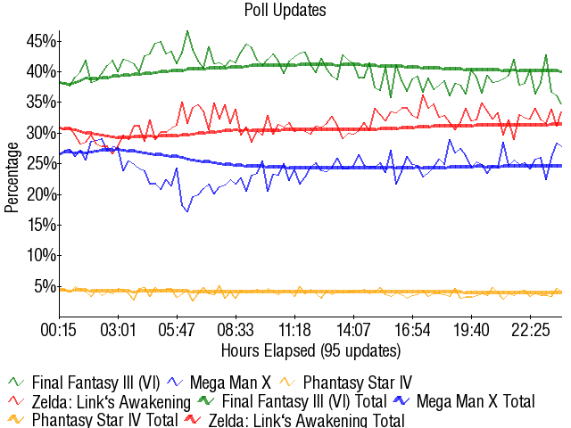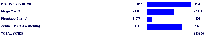 Final Fantasy VI - 41.22% Zelda: Link's Awakening - 27.29% Mega Man X - 24.57% Phantasy Star IV - 7.18% |