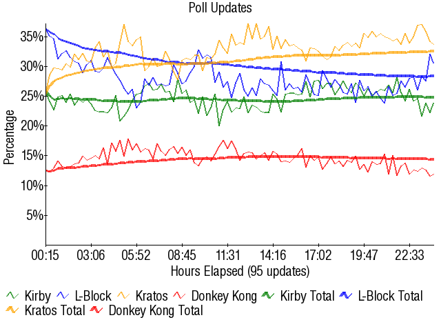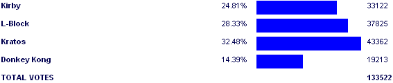 Kratos - 30.98% Kirby - 29.12% L-Block - 21.12% Donkey Kong - 18.84% |
