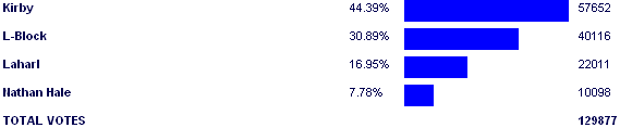 Kirby - 51.03% Laharl - 19.04% L-Block - 18.94% Nathan Hale - 10.93% |