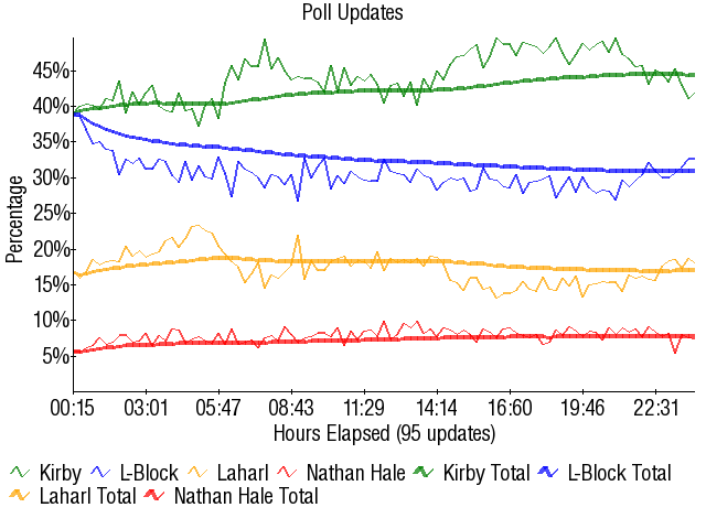 Kirby was obviously supposed to go berserk from here, and he did in the next update. 33 vote lead, boom, over.