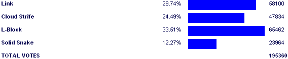 Link - 30.77% L-Block - 28.89% Cloud - 25.69% Solid Snake - 14.61% |