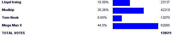 Mega Man X - 45.36% Mudkip - 25.56% Lloyd Irving - 16.73% Tom Nook - 12.34% |