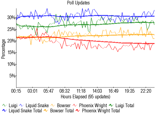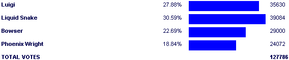 Liquid Snake - 28.81% Luigi - 28.20% Bowser - 27.77% Phoenix Wright - 15.22% |