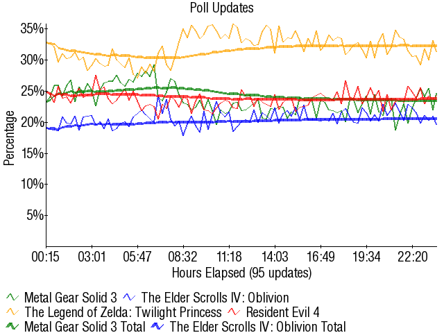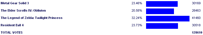 Zelda: Twilight Princess - 29.64% Resident Evil 4 - 27.31% Metal Gear Solid 3 - 24.42% The Elder Scrolls IV: Oblivion - 18.68% |