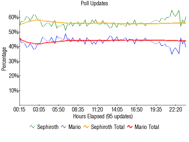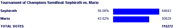 To put this in perspective, Mario won a total of ONE five minute update throughout the match. In this update, he took a grand total of four votes off of Sephiroth's lead. He also tied Sephiroth in another update. Mario did better during the standard Nintendo votes than he did at others, but all this match was was an extended beatdown that was slightly slower at parts.