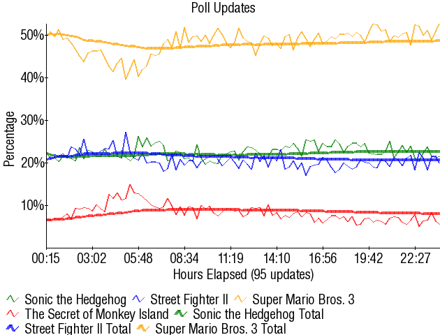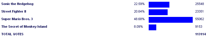 Super Mario Bros. 3 - 50.44% Sonic the Hedgehog - 21.33% Street Fighter II - 20.47% Secret of Monkey Island - 7.93% |