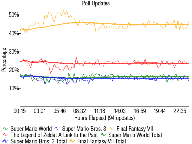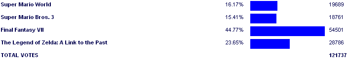 Final Fantasy VII - 39.37% Zelda: A Link to the Past - 23.13% Super Mario Bros. 3 - 18.88% Super Mario World - 18.74% |